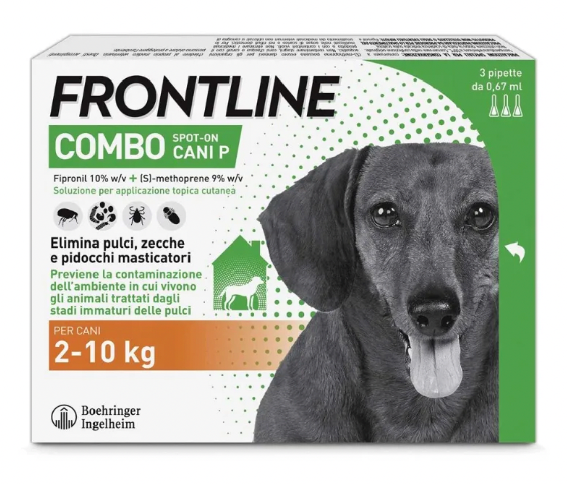 Per il trattamento dei cani di peso compreso tra i 2 e i 10 kg: da utilizzare nei confronti delle infestazioni da pulci, zecche e pidocchi masticatori. Trattamento delle infestazioni da pulci (Ctenocephalides spp.). L’attivita’ insetticida nei confronti di nuove infestazioni da pulci adulte persiste per 8 settimane. Previene la moltiplicazione delle pulci inibendo lo sviluppo delle uova (attivita’ ovicida), delle pupe e delle larve (attivita’ larvicida) nate dalle uova deposte dalle pulci adulte, per 8 settimane dopo l’applicazione. Trattamento delle infestazioni da zecche (Ixodes ricinus, Dermacentor variabilis, Dermacentor reticulatus, Rhipicephalus sanguineus). Il prodotto ha un’attivita’ nei confronti delle zecche persistente fino a 4 settimane. Trattamento delle infestazioni da pidocchi masticatori (Trichodectes canis). FRONTLINE COMBO SPOT-ON CANI P puo’ essere utilizzato nel programma per il controllo della Dermatite Allergica da Pulce (DAP).